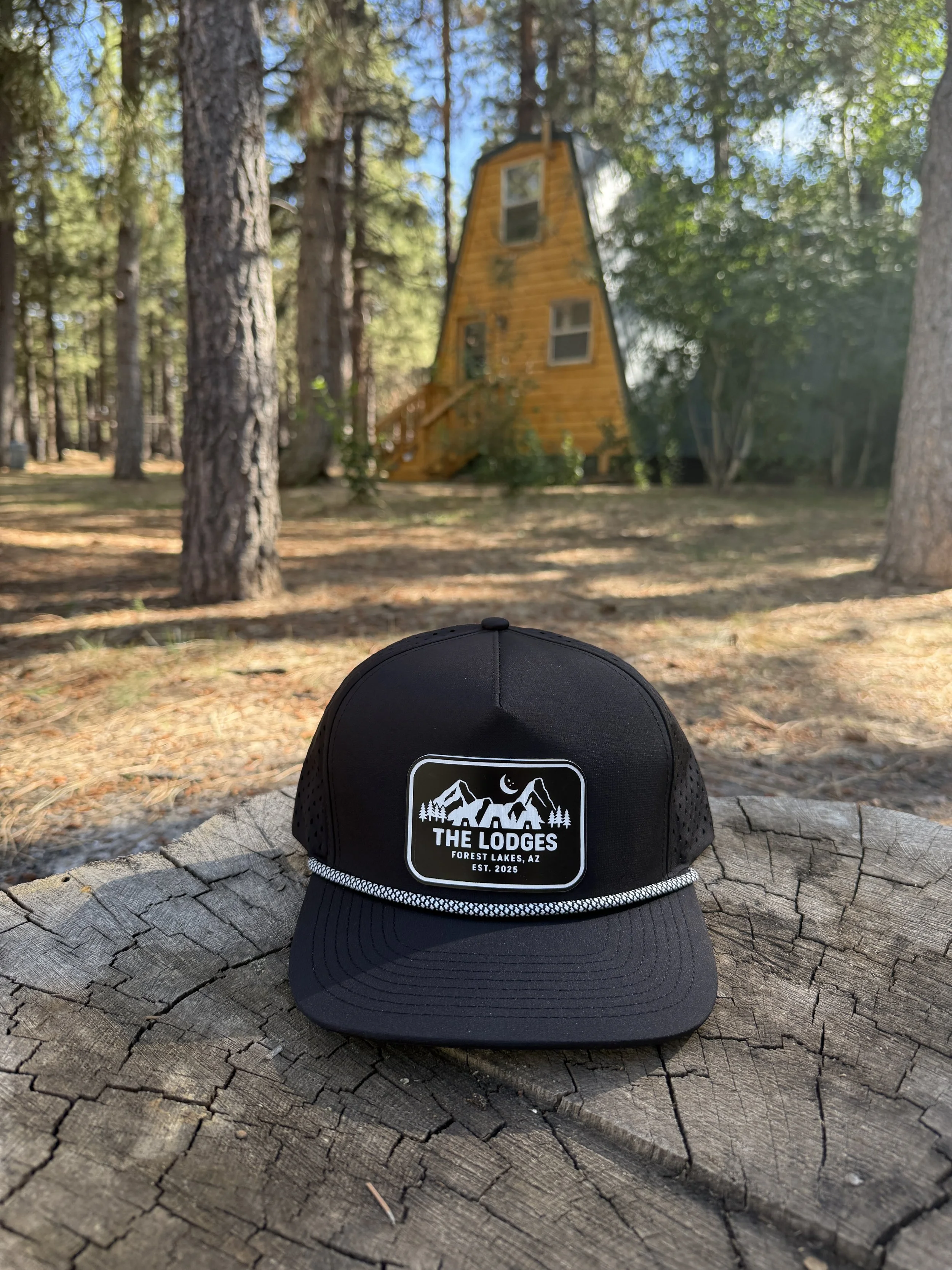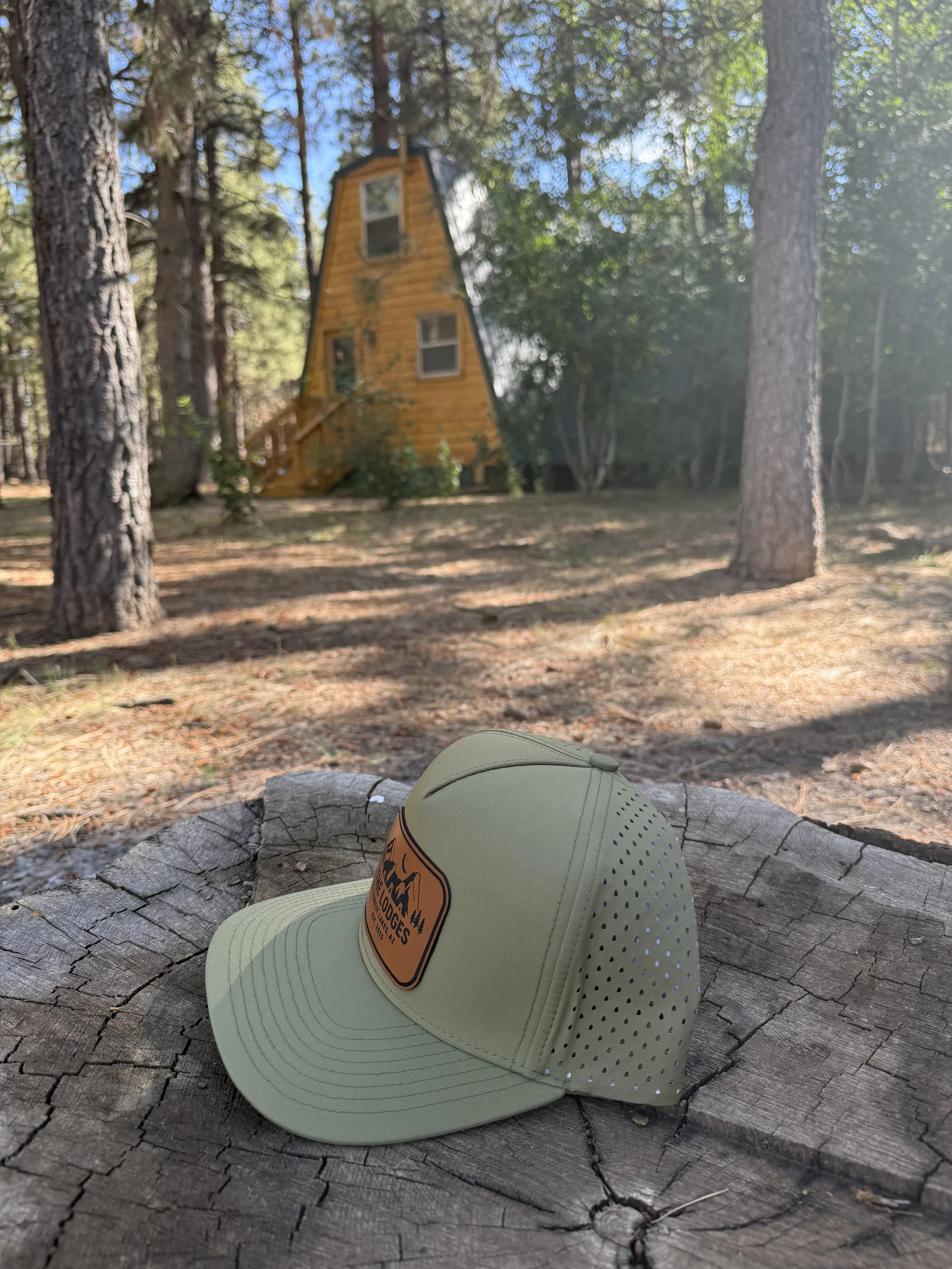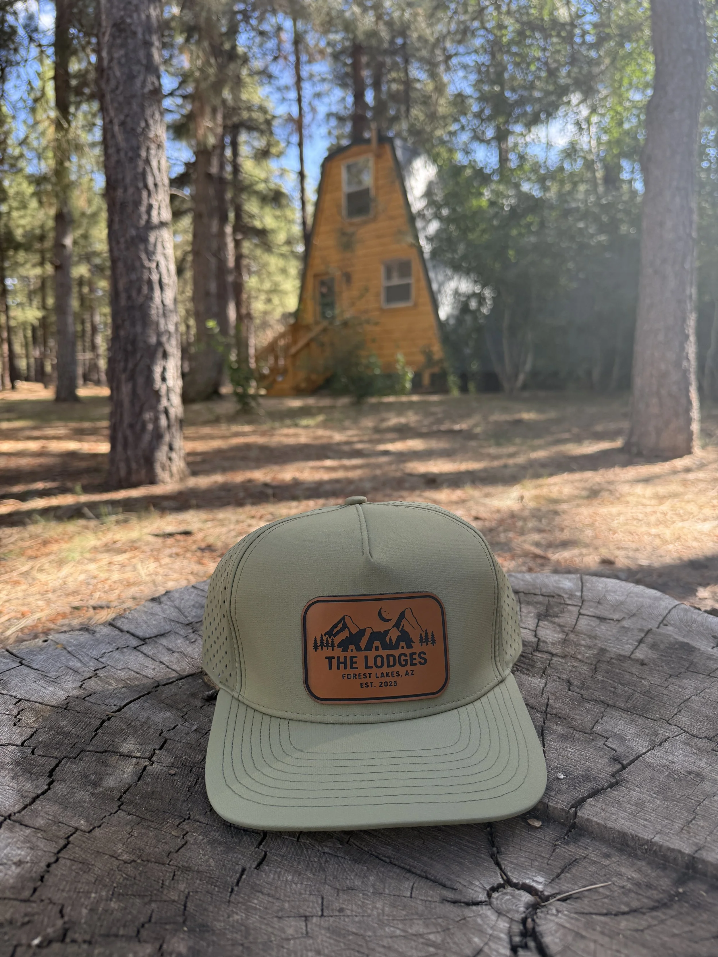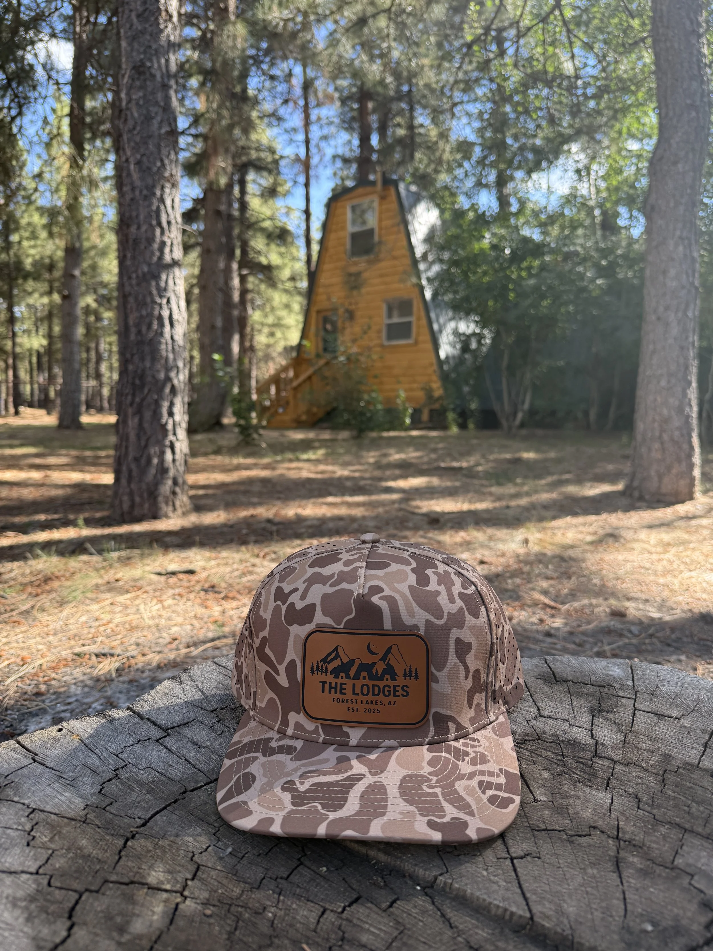 The trucker snap back hats come in forest green, tan, camo, black with a brown leather patch, or black with a black and white leather patch all with The Lodges logo on the front.