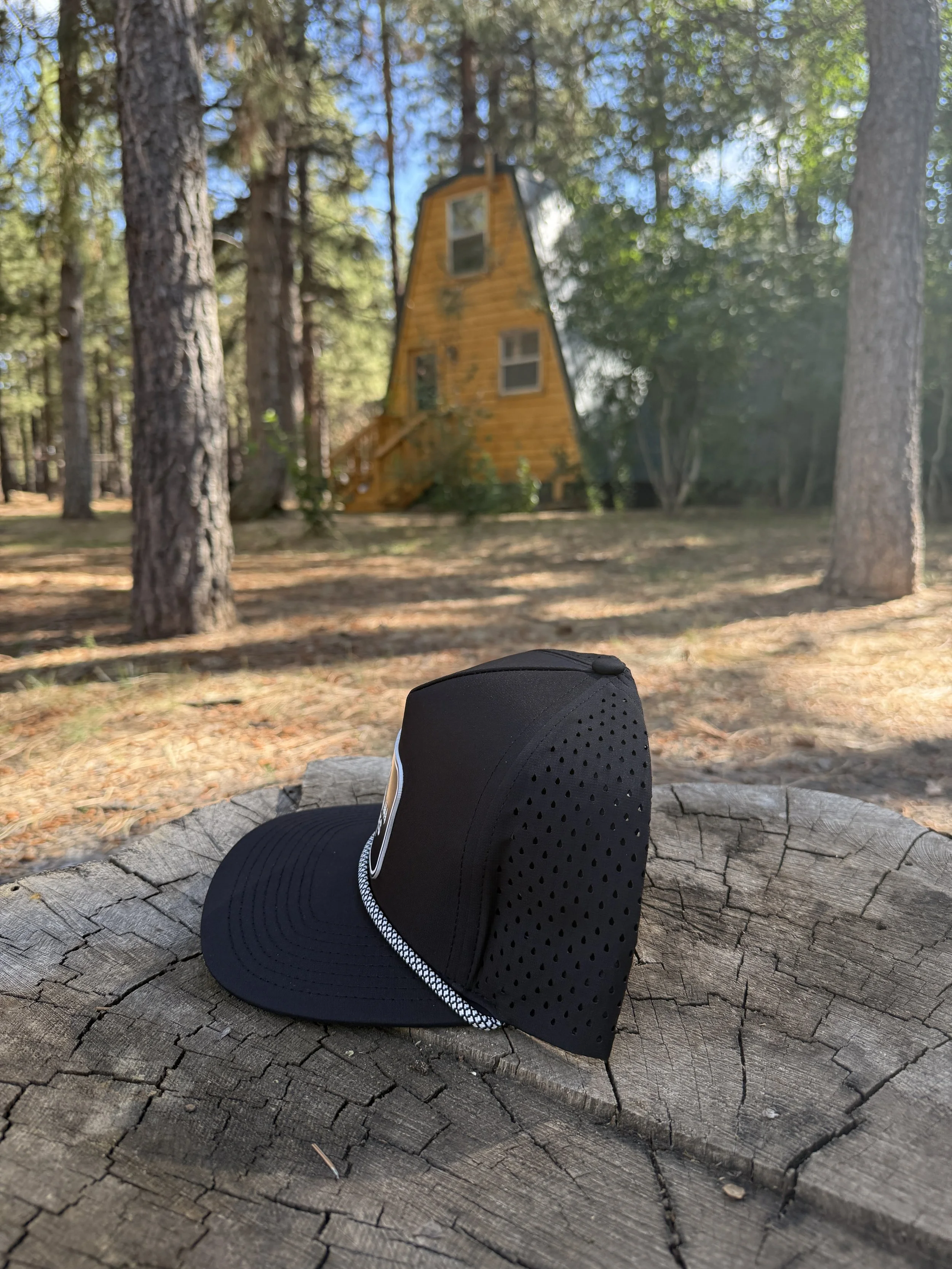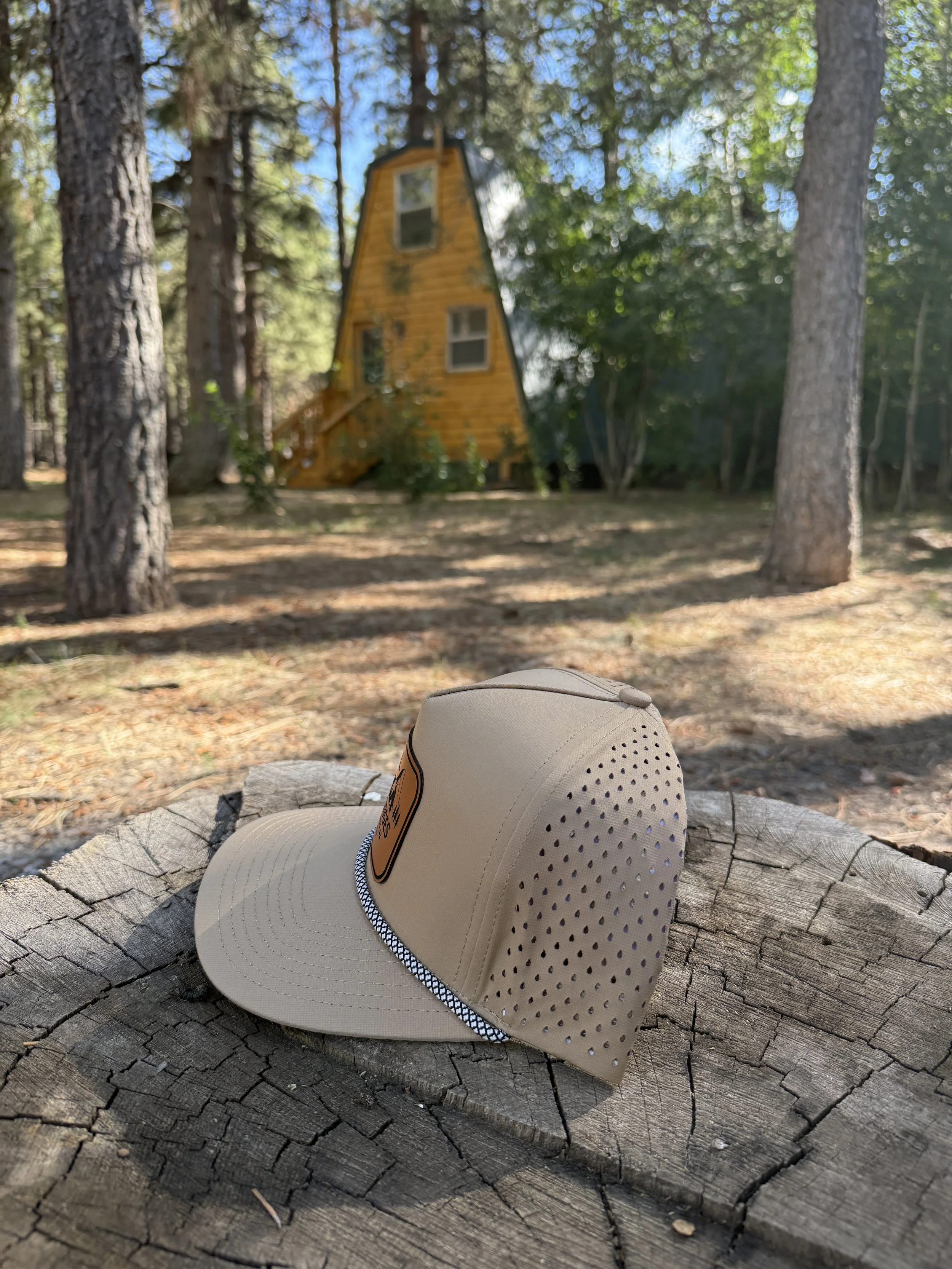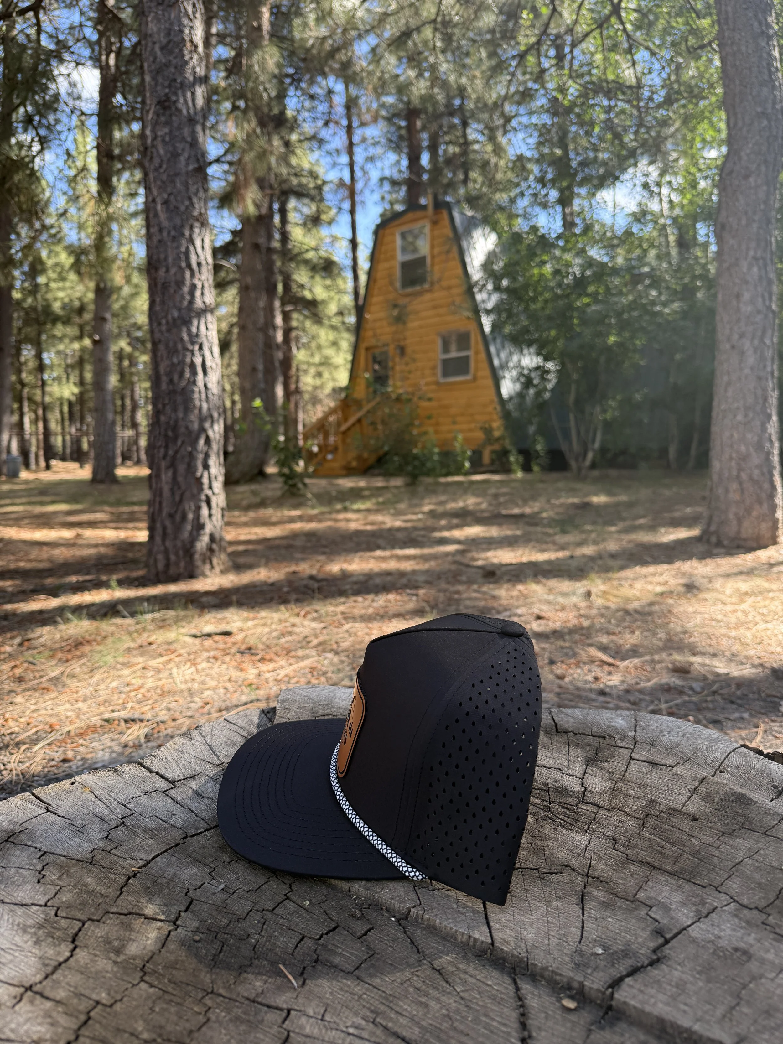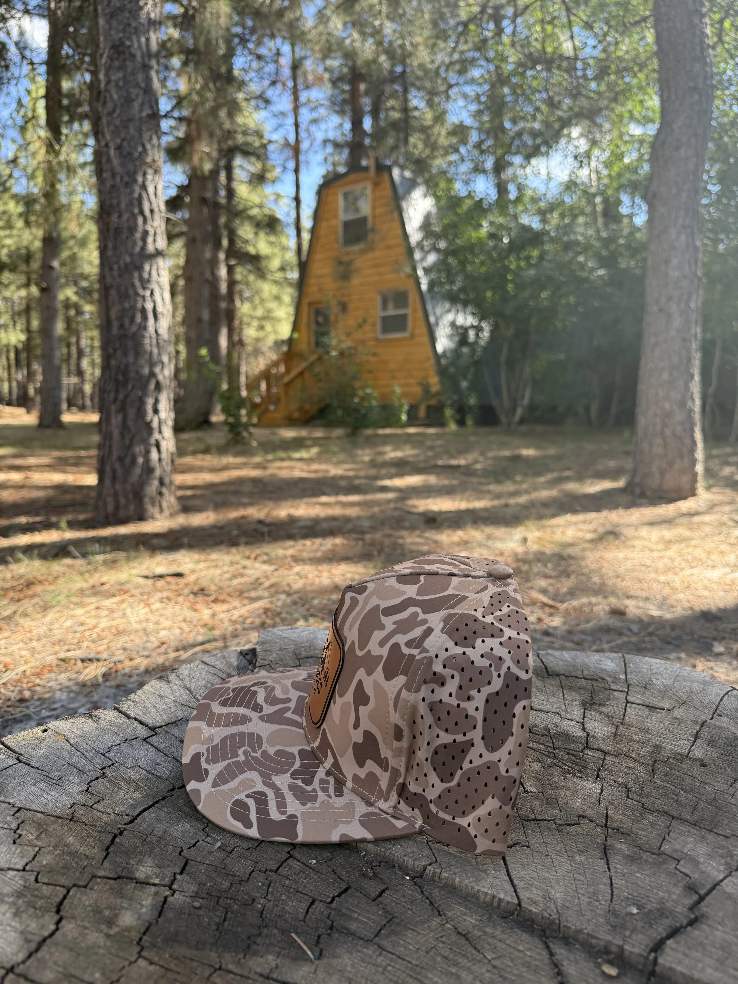 The trucker snap back hats come in forest green, tan, camo, black with a brown leather patch, or black with a black and white leather patch all with The Lodges logo on the front.